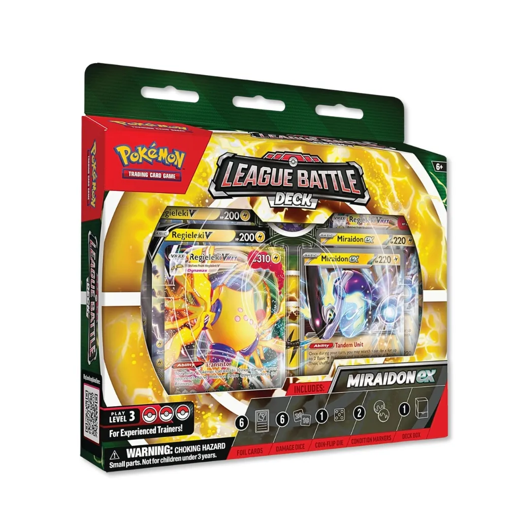 Team up with the legendary Miraidon ex and electrify matches with the power of lightning! This Pokémon ex is yours in this powerful, League-ready deck for skilled Trainers and Pokémon TCG players. With a slew of cards including premium foil cards, sought-after power cards, and a well-tuned set of Pokémon and Trainer cards, the Miraidon ex League Battle Deck does more than feature one of the most popular Pokémon of the Paldean region: it puts together all the elements to support you in your next match against friends and neighbors, in person or online!